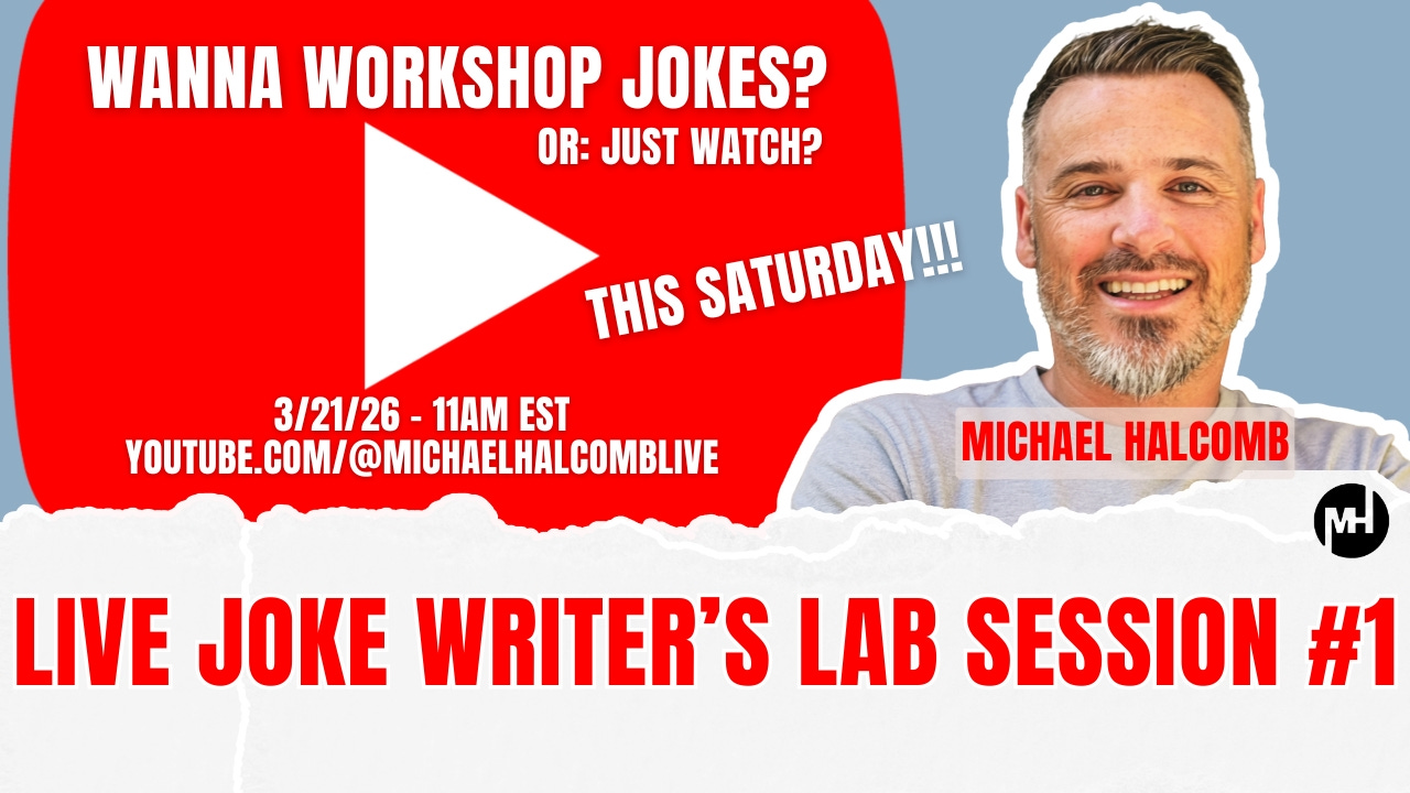 Friends, this weekend I’ll be doing my very first live stream. It’ll be part of a new series titled “Joke Writer’s Lab Sessions.” I’ll be going live over on YouTube at 11am-12pm EST. I’ll be working on a new joke from scratch (I’ll come up with something on the spot), and I’m also hoping others will be there so we can workshop some stuff together. None of this will be pre-planned. 100% of it will be live. So, if you’ve got some space available on your calendar, head over to my YouTube page HERE at 11am EST this Saturday. CLEAN MATERIAL ONLY!!! Oh, and if you’re reading this and plan on coming, shoot me a message on here or elsewhere and let me know. Peace!