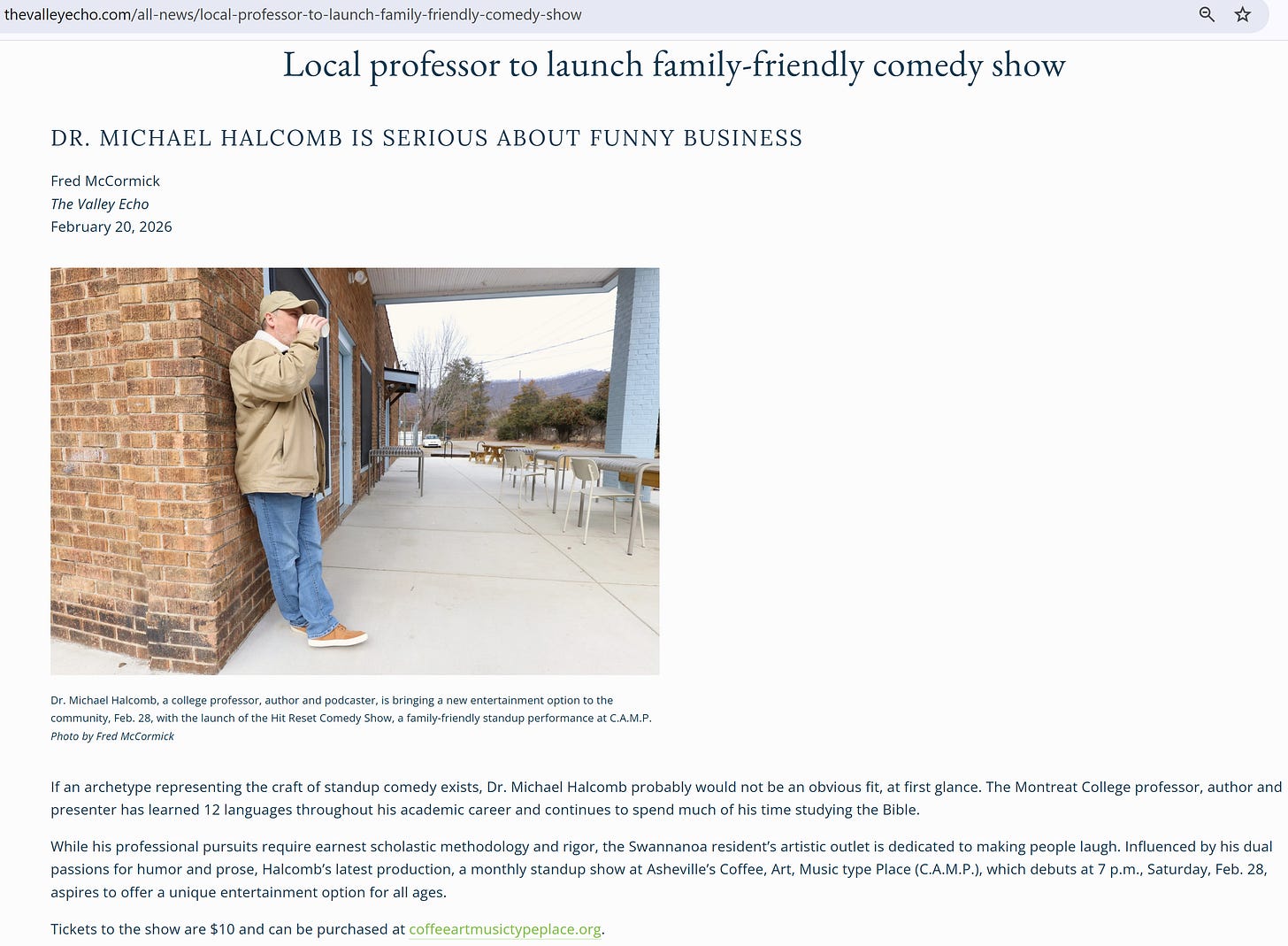 Hi, Friends! I’m stoked to share some more press. This one’s pretty special. I was the feature story for our local paper today “The Valley Echo.” The author, Fred McCormick, did an awesome job with the article. Just below is a snippet of the article, but I’d encourage you to check out the full feature HERE. But, maybe before you do that, grab a ticket to next weekend’s upcoming show HERE. Support good, clean, local comedy wherever you are.