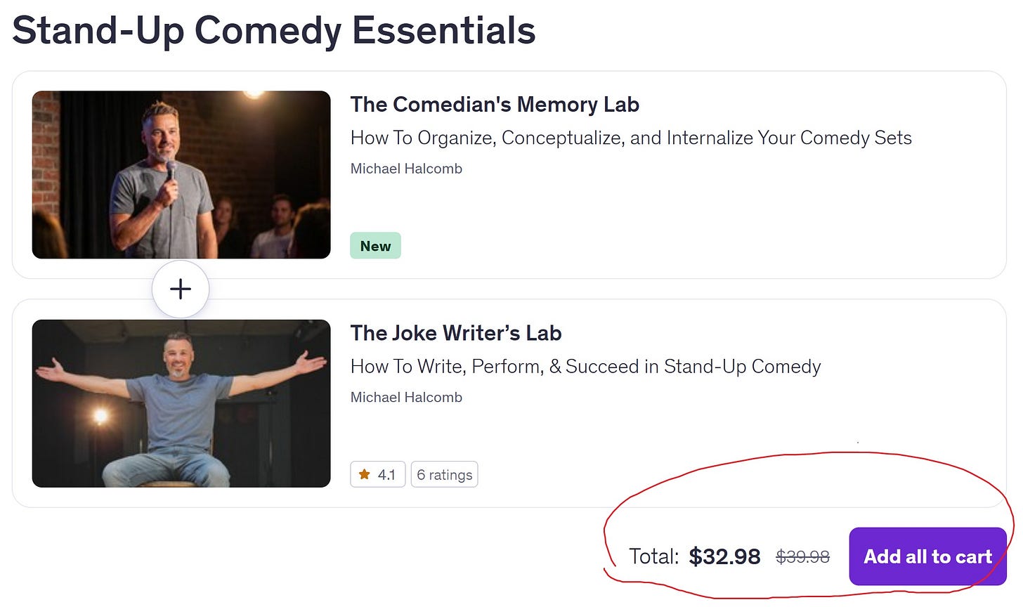 That’s why I’ve put together something I’ve never offered before: The Stand-Up Comedy Essentials bundle. And it’s only available from now until Feb 15. You can get the bundle by going to either of the course links just below and, near the bottom, selecting the “Add all to cart” button (see screenshot).