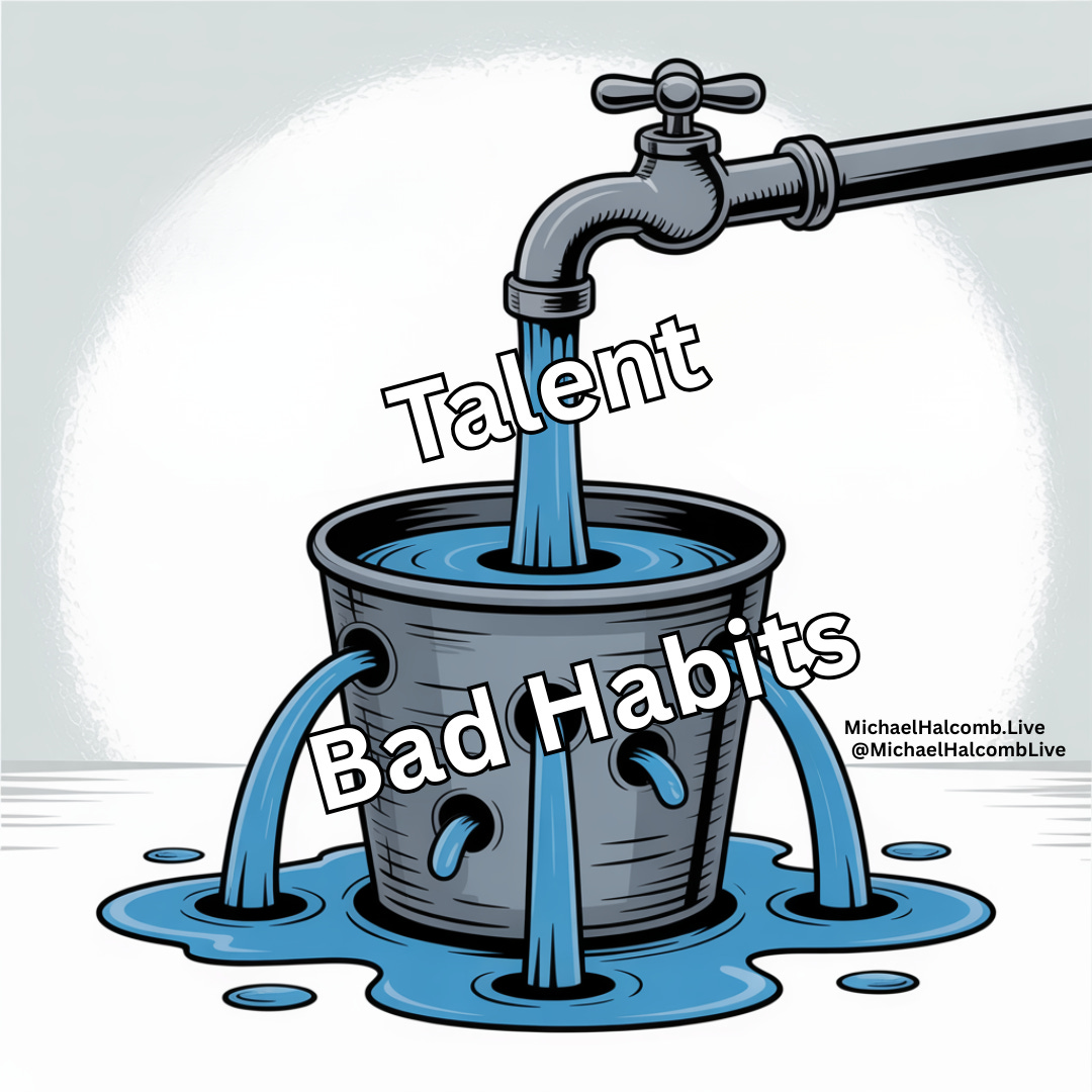 I saw a fellow comedian, Dobie Maxwell, post an image recently that, because of it’s grainy/low-quality, I decided to remix and put a little of my own spin on. The image, as you see above, is of a water spigot pouring into a bucket (see above). The water represents talent. The bucket, of course, has holes in it. The holes are representative of bad habits, things like “poor work ethic,” “pride,” “envy,” “impulsiveness,” “excuses,” “inconsistency,” etc. And of course, the water, the talent, just runs out of the bucket through those holes. The point is: you can be the most naturally gifted or talented person in the world, but if your life has too many leaks, your talent never builds toward anything.